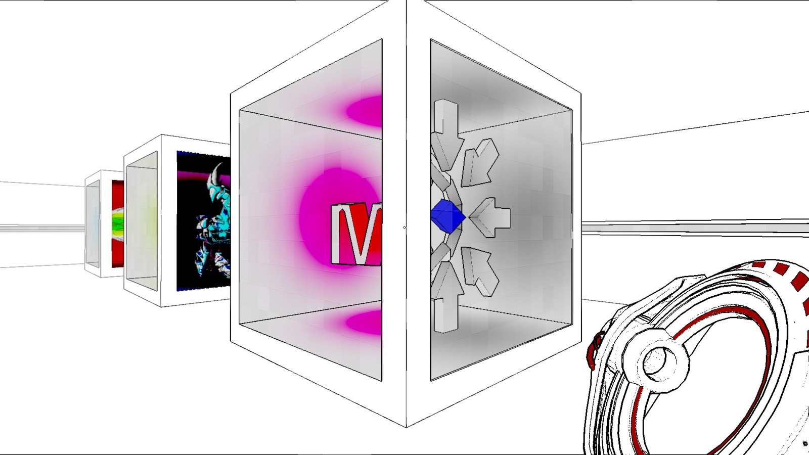 A room with 4 walls full of blocks. Pressing all of the extruded blocks will open the elevator
